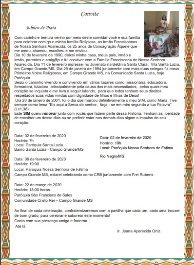 Dia 10 de fevereiro de 1990, deixei minha casa, meus pais, irmão e irmãs, parentes e amigos e fui conviver com a Família Franciscana de Nossa Senhora Aparecida. Dia 11 de fevereiro ingressei no Juvenato na Betânia Santa Clara, Vila Santa Luzia, em Campo Grande/MS. Dia 29 de janeiro de 1995 juntamente com mais duas colegas fiz meus Primeiros Votos Religiosos, em Campo Grande/MS, na Comunidade Santa Luzia, hoje Paróquia.