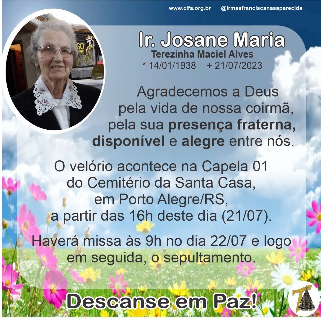 Ir. Josane realizou sua missão! Ela foi Conselheira Geral, atuou na Escola Frei Pacífico e no Colégio Rainha do Brasil – vice-diretora. Trabalhou, também em Porto Espiridião/MT; e no Mato Grosso do Sul, atuou nas cidades de Costa Rica, Campo Grande e Rio Negro. Nos últimos anos estava em Bom Retiro do Sul para cuidados de saúde, onde faleceu, na idade de 85 anos.
