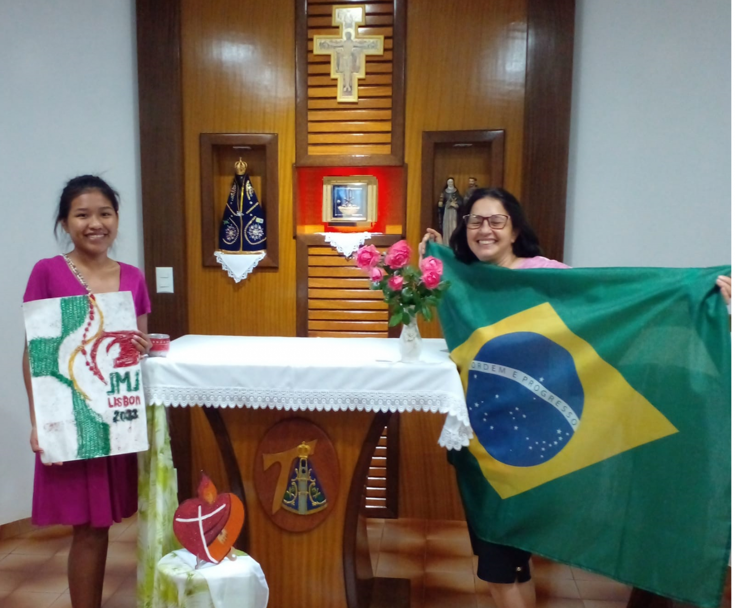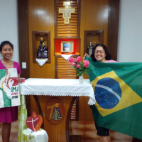 Ir. Solange rumo a JMJ com a jovem indígena Francineli Gaudino Pio, da etnia Terena da aldeia Bananal/ Aquidauana - MS. Colaboração: Ir. Solange Lussi
