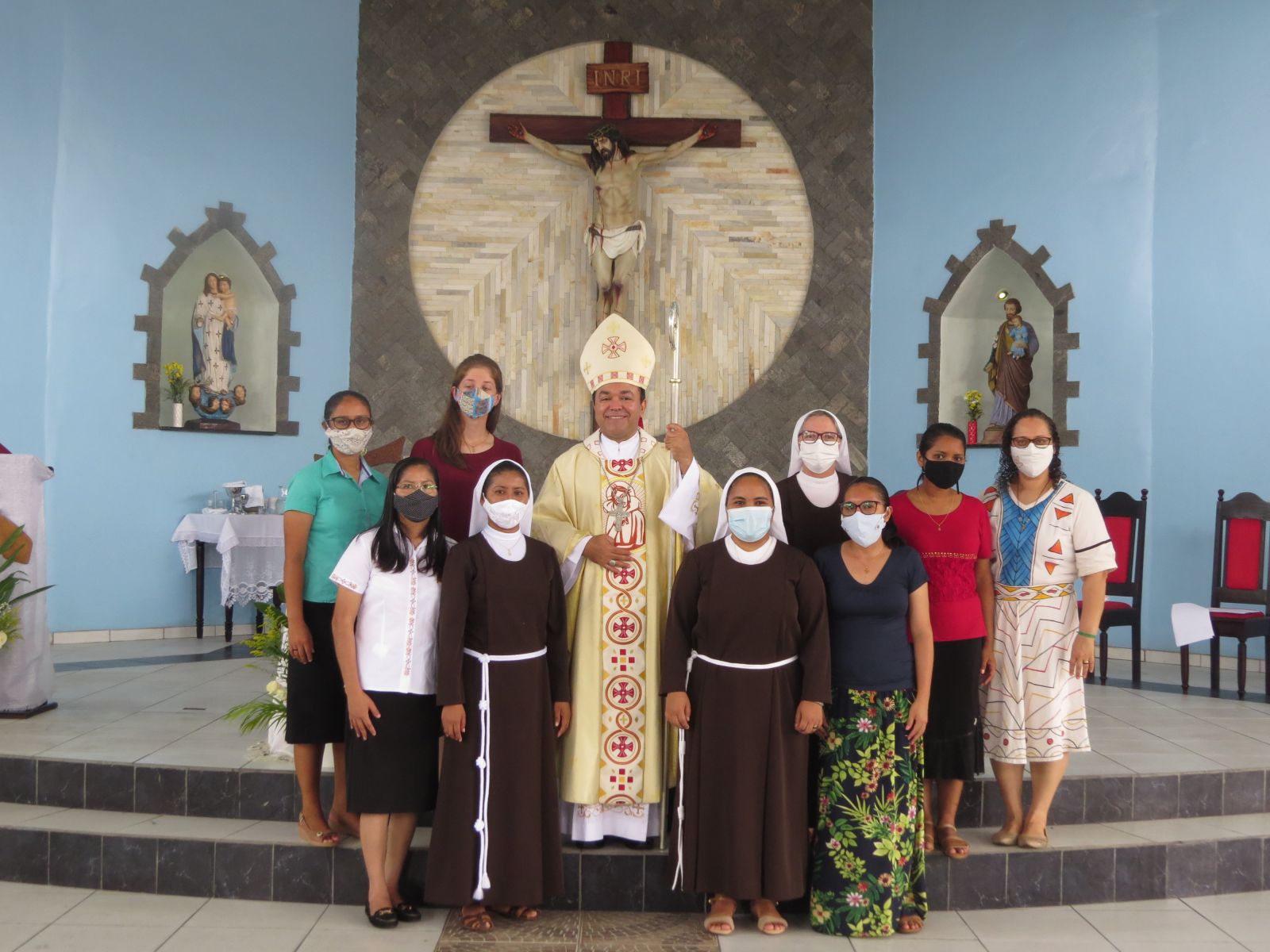Ir. Keila com o lema: “Eis aqui a serva do Senhor, faça a sua vontade” (Lc 1, 26). Eu, Ir. Josane com o lema: “Eis-me aqui, envia-me” (Is 6, 8), professamos definitivamente nossos votos de pobreza, obediência e castidade na forma de vida das Irmãs Franciscanas de Nossa Senhora Aparecida. A celebração foi presidida por Dom Edmilson Tadeu Canavarros dos Santos, Salesiano de Dom Bosco (SDB), Bispo auxiliar da Arquidiocese de Manaus, que nos recordava o compromisso e sentido da Consagração: “Com a profissão religiosa não professamos uma doutrina para crer, ou uma ética para viver, ou uma liturgia para celebrar. Mas fazemos uma profissão de amor, ou melhor, confessamos que nos sentimos amados pelo Amor que jamais decepciona. É do amor que emana uma forma de vida como a de Francisco de Assis, toda centrada em Deus, vivida em comunidade, entregue ao serviço dos pobres. Tentando ressaltar o sentido mais profundo de nossa vida consagrada, eu os convido a contemplar o mistério da Eucaristia que celebramos e a escutar com o coração a Palavra de Deus que nos foi proclamada”. Dom Tadeu nos convidava a retomar o sentido da nossa profissão. Deus conta conosco em seu projeto. Somos gratas ao Senhor e a Congregação pela acolhida, cada experiência que nos oportunizou a crescer na Consagração e pertença a CIFA. Sem dúvida, nosso Sim manifestado e renovado é um sinal muito forte de esperança, coragem e fé, pois o tempo de Pandemia que estamos vivendo no mundo e na nossa querida Amazônia, não nos desanimou, mas deu-nos força para estarmos junto com o nosso povo nas suas dores, perdas, angústias e alegrias e confiar que o Senhor caminha conosco. Celebramos com muita alegria a Eucaristia e nela depositamos toda a nossa vida.